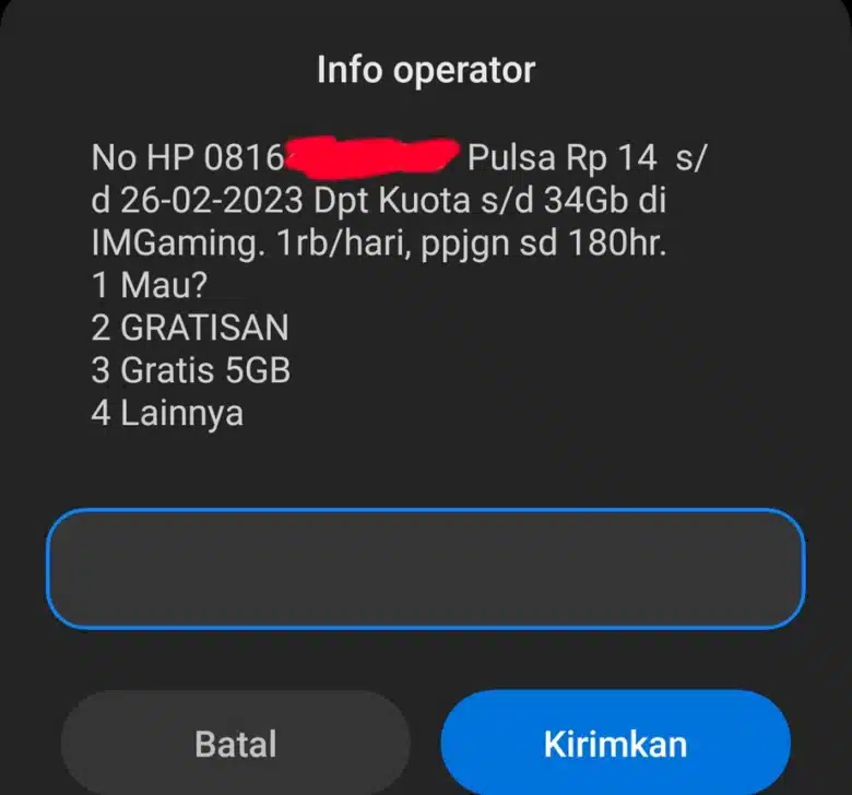 - Informasi nomor, sisa pulsa, dan masa aktif akan langsung muncul dalam bentuk pop-up.